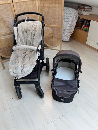 Carro de bebé Jané MUUM de dos piezas. - Incluye silla de paseo y capazo. - Color gris y beige. - Capazo con interior blanco y exterior gris oscuro. - Silla de paseo con funda acolchada beige. - regalo funda, bolso, funda para lluvia y colchón hipoalergénico nuevo (costó 40€) y sábanas. NO REALIZO ENVÍOS