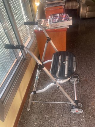 Andador de metal en color negro. Se encuentra en muy buen estado. - Estructura metálica. - Asiento negro. - Ruedas dobles en la parte trasera.