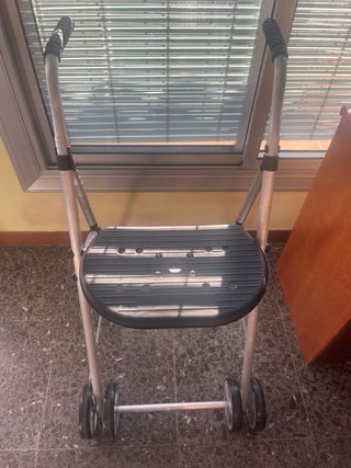 Carrito andador con asiento, ideal para personas mayores. Su diseño permite un fácil desplazamiento y ofrece un lugar para descansar. - Estructura metálica. - Asiento integrado. - Cesta de almacenamiento. - Ruedas para movilidad.