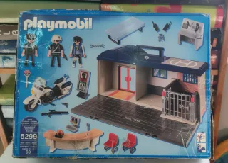 Set de Playmobil City Action, modelo 5299. - Incluye figuras de policía y un ladrón. - Estación de policía con celda. - Moto de policía.