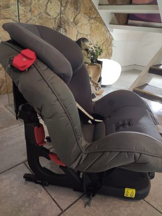Silla de coche en color gris, con base negra y detalles en rojo. - Sistema de sujeción. - Reposacabezas ajustable. - Indicador de peso en la base.