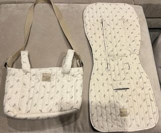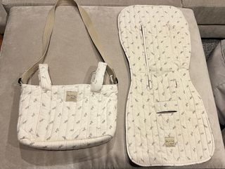 Conjunto de bolso organizador y colchoneta para bebé de la marca Walking Mum. - Diseño acolchado con estampado de ramitas. - Bolso con asas y correa. - Colchoneta con aberturas para arnés.