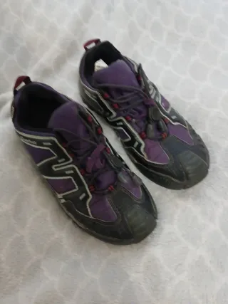 Botas de montaña Quechua en talla 32. Perfectas para senderismo y actividades al aire libre. - Color morado y negro. - Cierre con cordones. - Suela de goma.