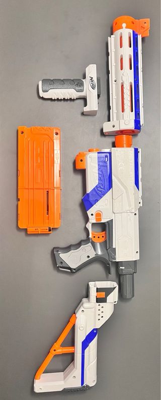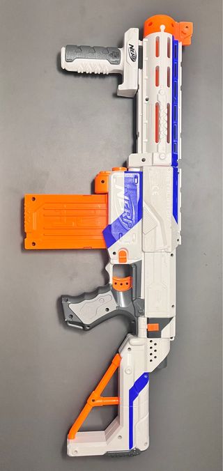 Lanzador Nerf N-Strike Elite Retaliator en color blanco, naranja y azul. Incluye cargador. - Diseño icónico de Nerf. - Empuñadura táctica. - Culata ajustable.