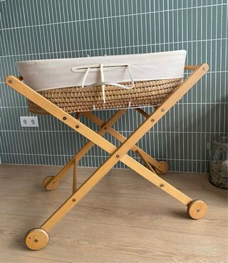 Moisés cuna de mimbre con un soporte de madera plegable. - Cesta de mimbre tejida. - Estructura de madera con ruedas. - Diseño natural y acogedor.