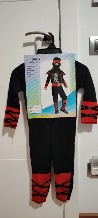 Disfraz de ninja para niños, ideal para fiestas o Halloween. Incluye máscara, cinturón y detalles de dragón. - Traje completo de ninja. - Diseño en color negro con detalles en rojo. - Estampado de dragón en la parte frontal.