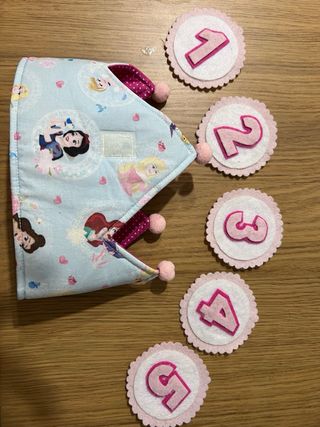 Corona de cumpleaños con temática de princesas, ideal para celebraciones. Incluye números para personalizar la edad. - Corona de tela con pompones. - Diseños de princesas. - Incluye números del 1 al 5. -2 opciones de corona