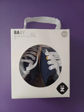 Preciosos zapatos para bebé en talla 19/20. - Color azul marino con detalles amarillos. - Cierre con cordones blancos. - Suela de goma. - Diseño tipo zapatilla deportiva.