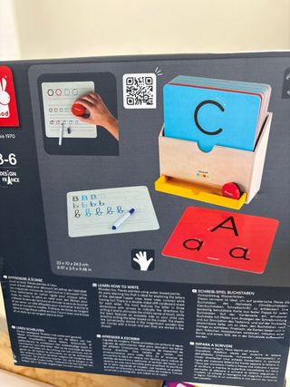 Set de tarjetas educativas de la marca Janod para aprender a escribir las letras. - Incluye tarjetas con letras mayúsculas y minúsculas. - Diseño de la marca Janod. - Material de madera y cartón. - Apto para niños de 3 a 6 años.