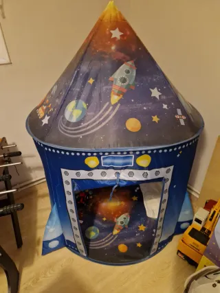 Divertida casita con temática espacial para niños. - Diseño de cohete y estrellas. - Ideal para jugar en interiores. Viene con varillas. Se puede vender montada :)