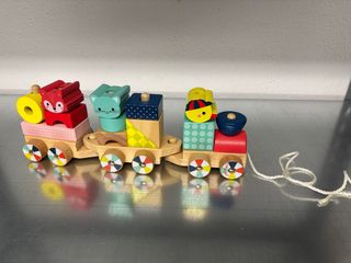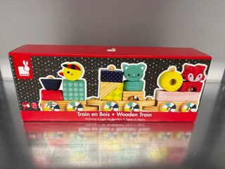 Tren de madera Janod con divertidas figuras para encajar. Ideal para el desarrollo de la motricidad fina. - Piezas de madera con diseños de animales y formas. - Vagones de colores vivos. - Incluye cuerda para arrastrar.