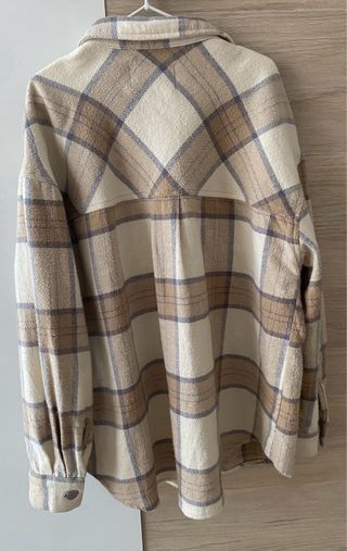 Camisa tipo franela para niña de Zara, con un diseño de cuadros en tonos beige y marrón. Se encuentra en buen estado. - Cuello camisero. - Cierre de botones. - Dos bolsillos en la parte delantera.
