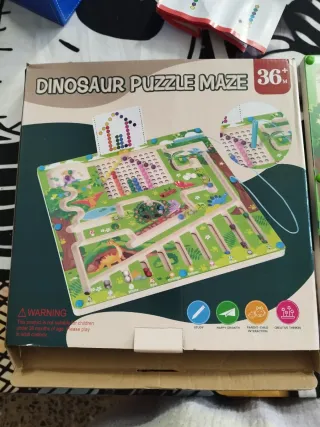 Laberinto magnético de madera con temática de dinosaurios. Incluye un tablero con cuentas de colores y un lápiz magnético para moverlas. - Diseño educativo con dinosaurios. - Tablero con laberinto y cuentas. - Lápiz magnético para guiar las cuentas. Prácticamente nuevo, en su caja, libro de instrucciones y ejemplos de dibujos sin abrir.