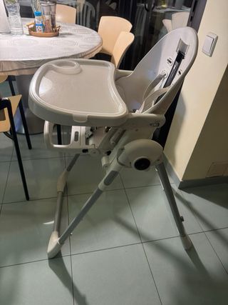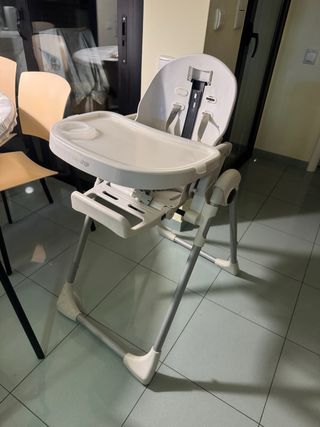 Trona Peg-Perego en color blanco y gris. Es un asiento cómodo y seguro para los más pequeños. - Bandeja extraíble. - Arnés de seguridad. - Altura regulable. - falta la funda asiento