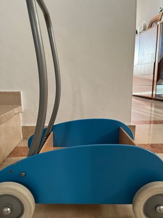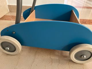 Carrito de madera de Ikea, ideal como andador. - Color azul. - Diseño tipo coche. - Ruedas para facilitar el movimiento.