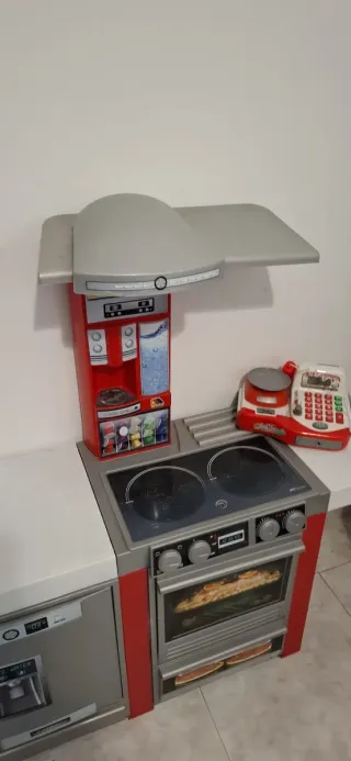 Divertida cocinita de juguete con varios electrodomésticos y accesorios. - Incluye horno, vitrocerámica y dispensador de agua. - Cafetera con cápsulas. - Balanza. - Nevera con dispensador de agua.