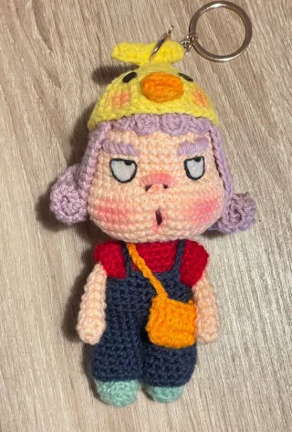 Llavero de muñeco hecho a mano con técnica Amigurumi. - Diseño de personaje con pelo rizado y ropa de colores. - Incluye un pequeño pato amarillo. - Adorno de cactus en la camiseta. - Medida 15 cm aprox. - Hecho con lana. Entrega con anilla para colgar. Más diseños en el perfil.