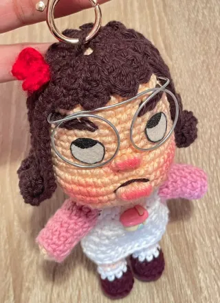Adorable muñeca tejida a mano con la técnica Amigurumi. Un personaje tierno y detallado. - Diseño de niña con gafas y ropa. - Adorno de rana en el pecho. - Medida 15 cm aprox. - Hecho con lana. Entrega con anilla para colgar. Más diseños en el perfil.