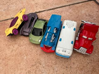 Conjunto de seis coches de juguete. - Coche deportivo amarillo con detalles morados. - Coche futurista morado. - Coche verde estilo Volkswagen Beetle. - Coche azul tipo camión con detalles plateados. - Coche blanco tipo autobús o caravana. - Coche rojo tipo camión con detalles plateados.