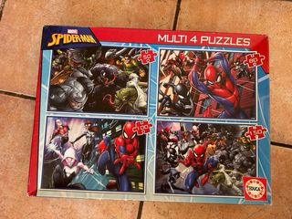 Pack de tres puzzles con personajes de Marvel y Disney. - Puzzle de Spiderman, Capitán Marvel y Iron Man (100 piezas). - Puzzle de Spiderman y Gwen Stacy (48 piezas). - Puzzle de los Vengadores (100 piezas).