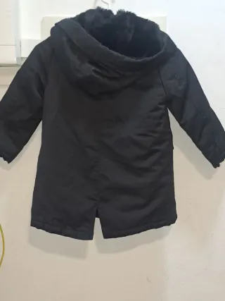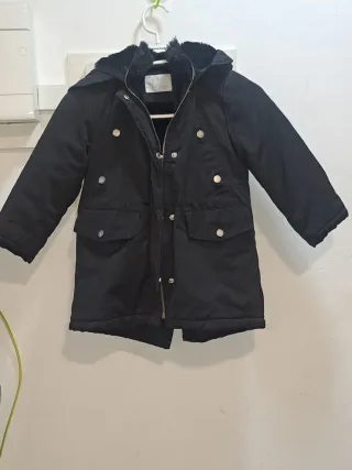 Abrigo negro de Zara para niña, perfecto para el frío. - Capucha con forro de pelo. - Cierre de cremallera y botones. - Dos bolsillos delanteros con solapa. 6 años