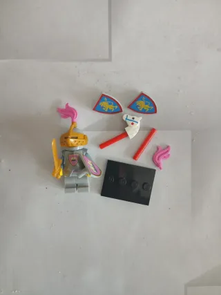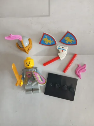 Minifigura de Lego de un caballero con sus accesorios. - Incluye casco dorado con pluma rosa. - Armadura gris con escudo. - Espada dorada. - Dos escudos decorados con leones. - Accesorios adicionales como un caballo de juguete y plumas rosas.