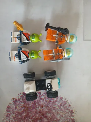 Lote de figuras Lego, incluye personajes alienígenas y astronautas. - Dos figuras de alienígenas verdes. - Dos figuras de astronautas naranjas con cascos. - Un vehículo pequeño de Lego blanco y negro con ruedas.