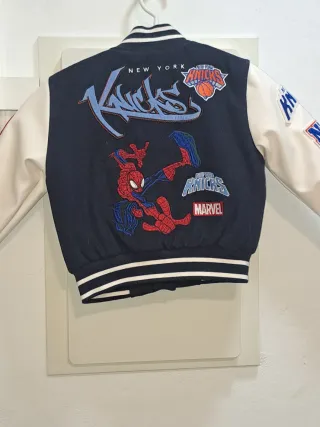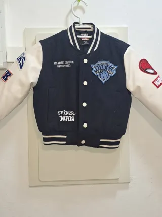 Chaqueta tipo bomber para niños con temática de la NBA y Marvel. - Diseño en color azul marino y mangas blancas. - Parche de los New York Knicks en el pecho. - Detalle de Spider-Man en una manga. - Inscripción Atlantic Division Basketball y Spider-Man bordada.