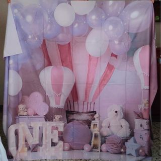 Precioso fondo para celebrar el primer cumpleaños. Ideal para crear un ambiente mágico y festivo. - Diseño con globos aerostáticos y tiernos ositos. - Tonos pastel en rosa y lila. - Motivos de estrellas y farolillos. Esta arrugado de estar guardado. Facil arreglo si se plancha con algo por encima para no dañarlo.