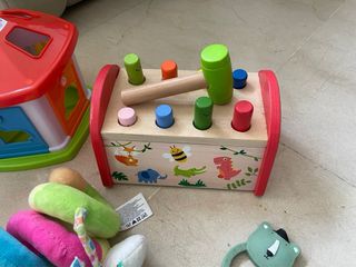 Lote de varios juguetes para bebé. - Casa de formas y colores. - Juego de madera con martillo. - Doudou con figura de hipopótamo. - Sonajero con forma de animal. - Pelota de tela. - Mordedores. Etc.