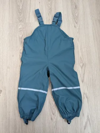 Pantalón impermeable de color azul verdoso con tirantes ajustables. - Tirantes con hebillas de plástico. - Dos bandas reflectantes en cada pierna. - Puños elásticos en los tobillos. - Cierre de botón a presión en los laterales.