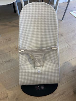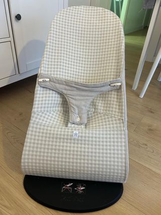 Hamaca para bebé de la marca BabyBjorn. Es cómoda y ergonómica. - Diseño a cuadros grises y blancos. - Incluye arnés de seguridad. - Base giratoria negra.