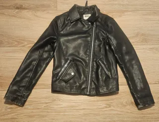 Cazadora estilo motero en polipiel negra. - Cierre de cremallera. - Bolsillos con cremallera. - Cuello solapa. Todas las cremalleras funcionan bien. Es cómoda y tiene un forro interior que la hace más abrigada. Está desgastada de cuello y puños, pero si tienes que disfrazar al/la cría/o es ideal.