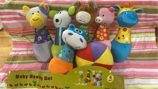Set de bolos de peluche con divertidos animales para bebés. Incluye una bola y varios bolos. - Diseño de animales variados. - Material suave de peluche. - Ideal para juego infantil.