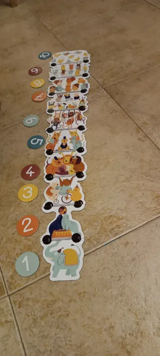 Juego educativo de puzzle con números y divertidos animales de circo. Ideal para que los más pequeños aprendan a contar. - Incluye 10 piezas de números. - Cada número tiene una ilustración de animales de circo. - Piezas de cartón resistente.