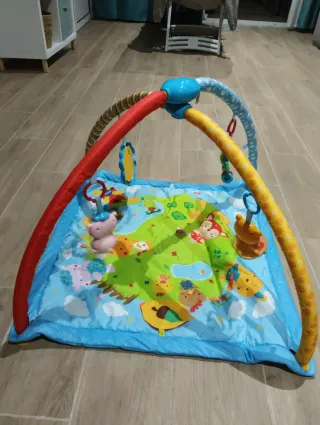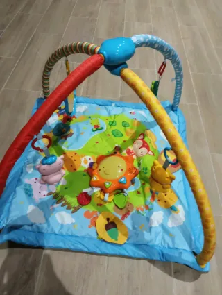 Manta de actividades para bebés con un diseño colorido y divertido. - Incluye arcos superiores con varios juguetes colgantes. - Tapete acolchado con dibujos de animales y elementos de la naturaleza. - Centro de actividades con luces y sonidos.
