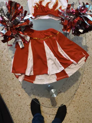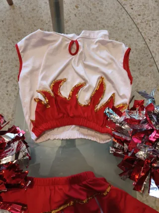 Conjunto de animadora infantil. - Top blanco con detalles de llamas rojas y doradas. - Falda roja y blanca a rayas. - Incluye dos pompones plateados y rojos.