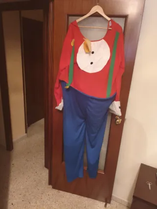 Disfraz completo de payaso, ideal para fiestas o eventos. - Parte superior roja con detalles blancos y botones negros. - Tirantes verdes. - Pantalón azul.
