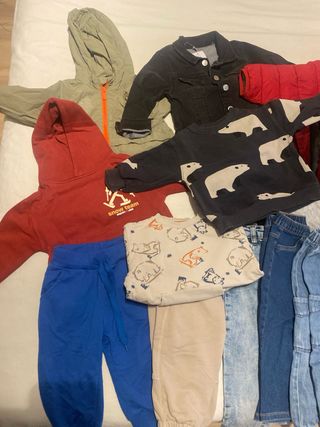 Lote de ropa para niño. - Chaqueta roja. - Chaqueta verde con capucha. - Chaqueta negra. - Sudadera gris. - Sudadera negra con osos polares. - Sudadera beige con osos. - Camiseta roja. - Pantalón vaquero azul. - Pantalón vaquero claro. - Pantalón azul. - Pantalón beige. Precio por todo el lote 30€ Posobilidad de pasar ropa cada cambio de temporada
