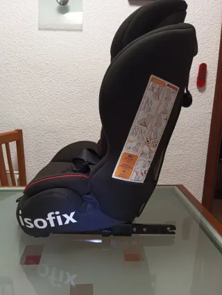 Silla de coche para bebés y niños pequeños, con sistema Isofix. - Diseñada para niños de 0 a 7 años. - Color negro con detalles rojos. - Incluye instrucciones de uso. También incluye el anclaje y soporte. Ha tenido muy poco uso (4 o 5 viajes)