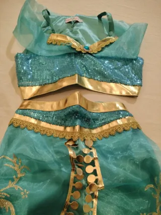 Disfraz inspirado en el personaje de Jazmín. - Conjunto de dos piezas. - Pantalones tipo bombachos con goma en los tobillos. - Parte superior tipo top con detalles de lentejuelas y abalorios dorados. - Tejido ligero y vaporoso en color turquesa. - Adornos dorados y estampados florales en los pantalones. - Talla 130cm (7-8años)