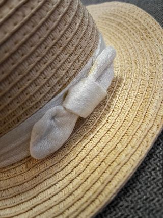 Sombrero de paja tejido, ideal para proteger del sol en días de playa o paseos. - Diseño infantil. - Adornado con una cinta blanca y lazo. - Material de paja natural.