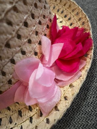 Bonito sombrero de paja para niña, talla 10. Ideal para protegerse del sol con estilo. - Diseño tejido con detalles calados. - Adornado con una cinta rosa y una flor. - Color base beige.