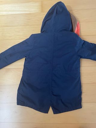Abrigo azul marino de Zara para niño, talla 8. Con capucha y forro interior en color naranja - Cierre de cremallera. - Bolsillos frontales con botón. - Cordones ajustables en la cintura.