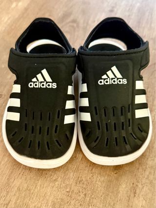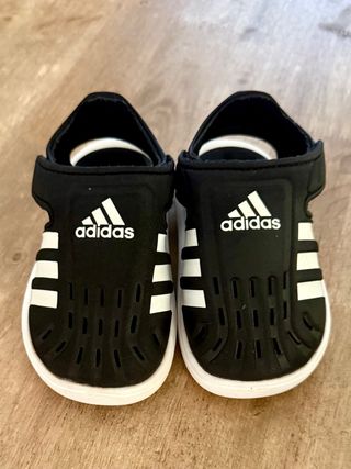 Sandalias deportivas Adidas para niño en color negro con las icónicas tres tiras blancas. - nº 22 - Cierre de velcro. - Diseño abierto para mayor ventilación. - Suela blanca. - Logo de Adidas en la pala.