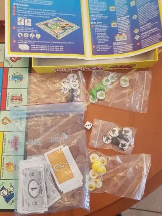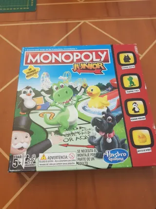 Juego de mesa Monopoly Junior, ideal para los más pequeños. - Edición Mi Primer Monopoly. - Incluye personajes como un pingüino, un dinosaurio T-Rex, un patito de goma y un perro. - Diseñado para niños a partir de 5 años. - Esta entero, no le falta ninguna pueza. - Salvo la caja que tiene unos pequeños rasguños, el resto esta impecable.