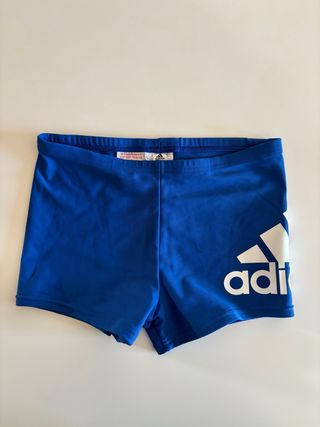 Bañador de natación para niño de la marca Adidas. Talla 11-12 años - Color azul vibrante. - Diseño con logo grande de Adidas en el lateral.