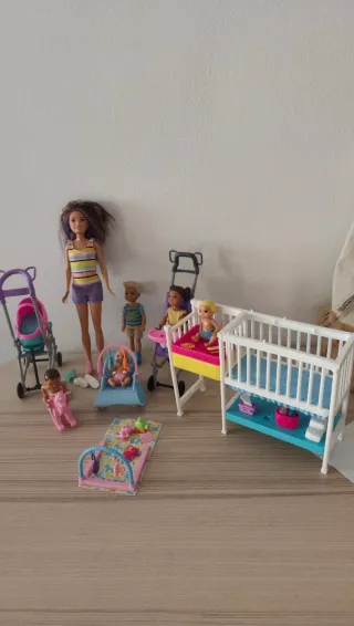 Conjunto de muñecas Skipper y accesorios para jugar. - Incluye una muñeca Skipper, 3 bebés y 2 niños. - Carritos de bebé. - Cuna. - Cambiador. - Colchoneta de juegos.