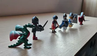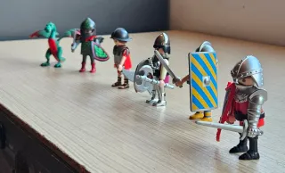 Lote de figuras de Playmobil con temática medieval y fantástica. Incluye un dragón y varios caballeros con sus escudos y armas. - Figura de dragón verde y rojo. - Caballero con armadura verde y escudo. - Soldado romano con armadura y hacha. - Caballero con armadura plateada y escudo a rayas.