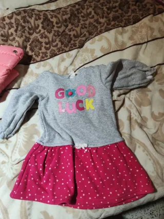 Vestido de niña afelpado con estampado Good Luck y detalle de flor. - Parte superior gris con letras. - Falda estampada con topos blancos sobre fondo fucsia. - Lazada blanca en la cintura.